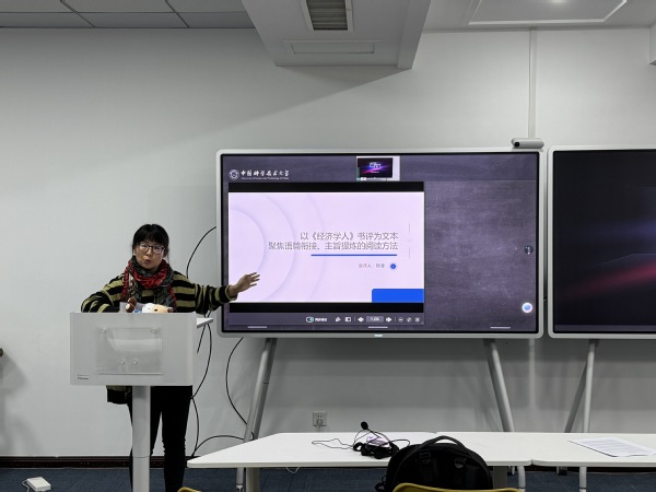 本次分享会以“聚焦语篇衔接与主旨提炼,探索读写教学新路径”为主题,由读写组的陈澄老师担任主讲。她结合学生在阅读与写作中的真实错误案例,精准剖析了学生在语篇衔接理解与运用方面存在的问题,并阐释了选择《经济学人》书评作为教学素材的优势。陈老师从知识、技能、意识三个维度设定教学目标,系统展示了引导学生识别语篇衔接规律、自主探究衔接方式、借助衔接破解长难句、通过词汇衔接链提炼主旨等完整教学流程,为提升大学英语阅读教学实效提供了可借鉴的实践思路。